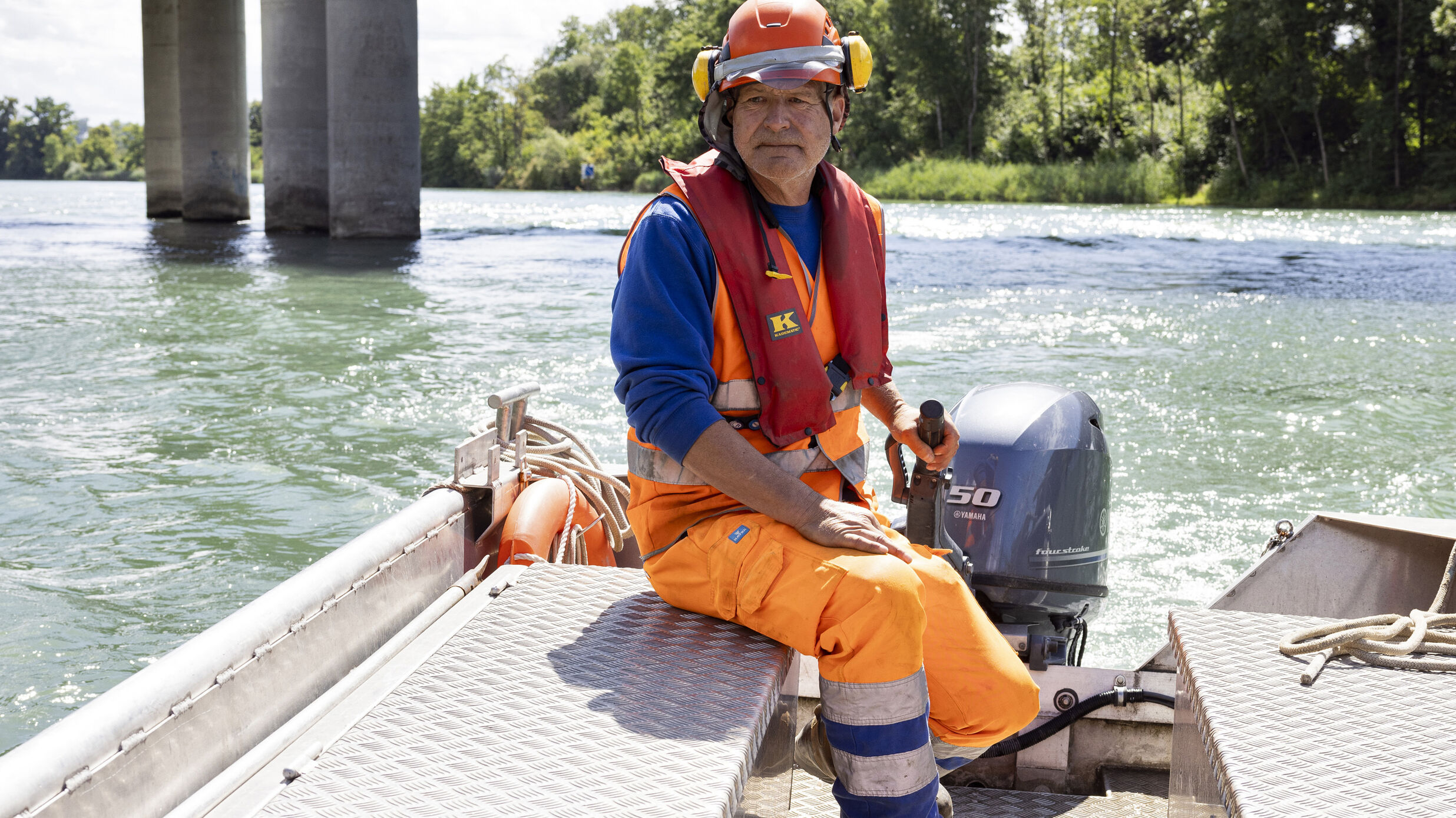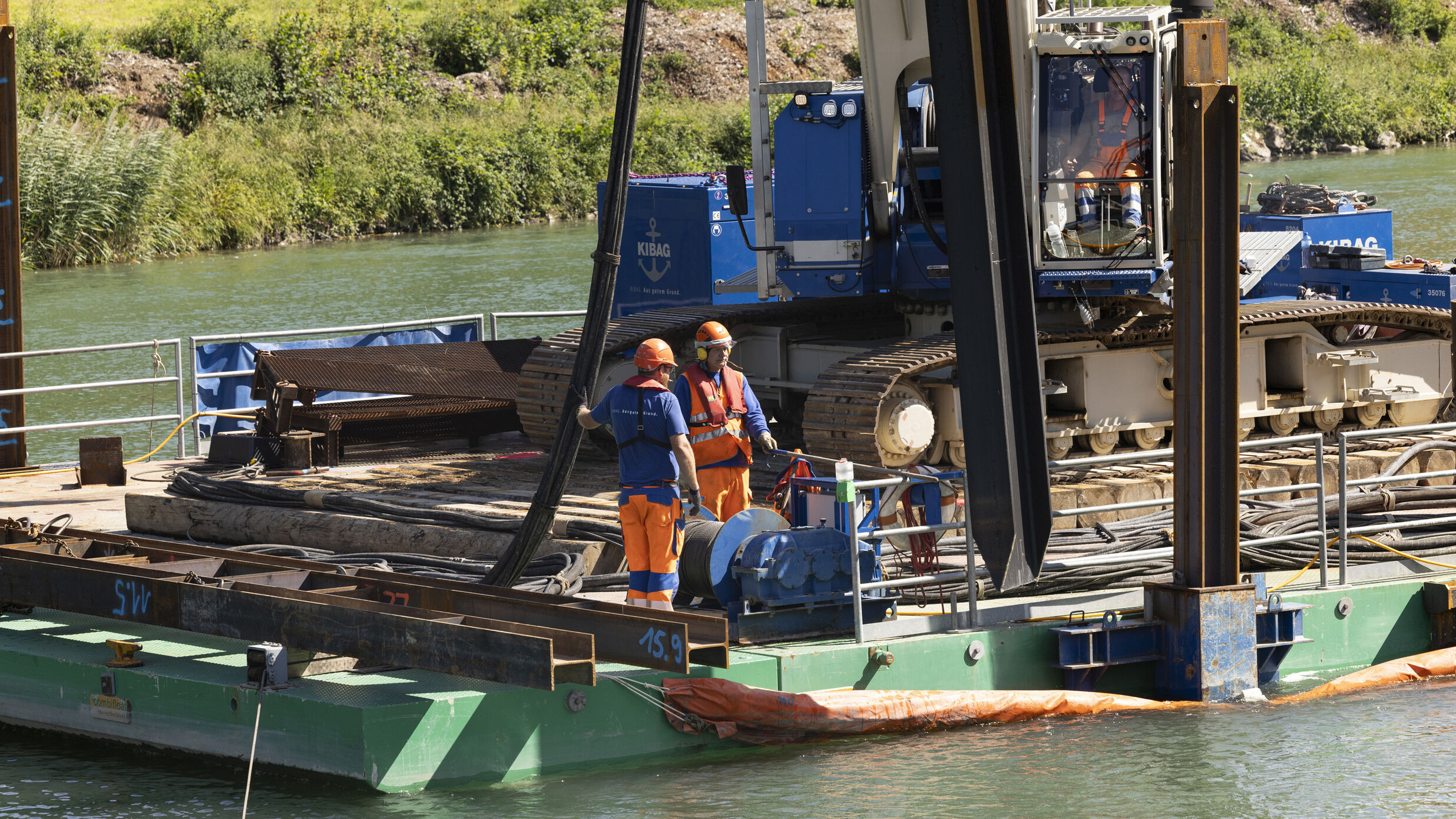 Für den Bau ebendieser neuen Brücke war im Juli und August als Subunternehmer auch der Wasser- und Spezialtiefbau vor Ort. Denn nicht nur die Zufahrt, sondern auch die Aarebrücke selbst, die die Autobahn über den Fluss führt, muss um zwei Spuren erweitert werden. Gelöst wird dies über eine parallel verlaufende, neue Brücke, die drei Fahrspuren führen wird. Die alte, bestehende Brücke wird saniert und wird anschliessend ebenfalls drei Spuren führen. W+S erstellt für diese Arbeiten eine Hilfsbrücke. Diese kommt auf Rammpfählen zu stehen. Über diese Hilfsbrücke gelangen Material und Maschinen an schwer zugängliche Stellen: Maschinen, wie sie zum Beispiel zum Bau von Brückenpfeilern und Fundamenten im Wasser benötigt werden.