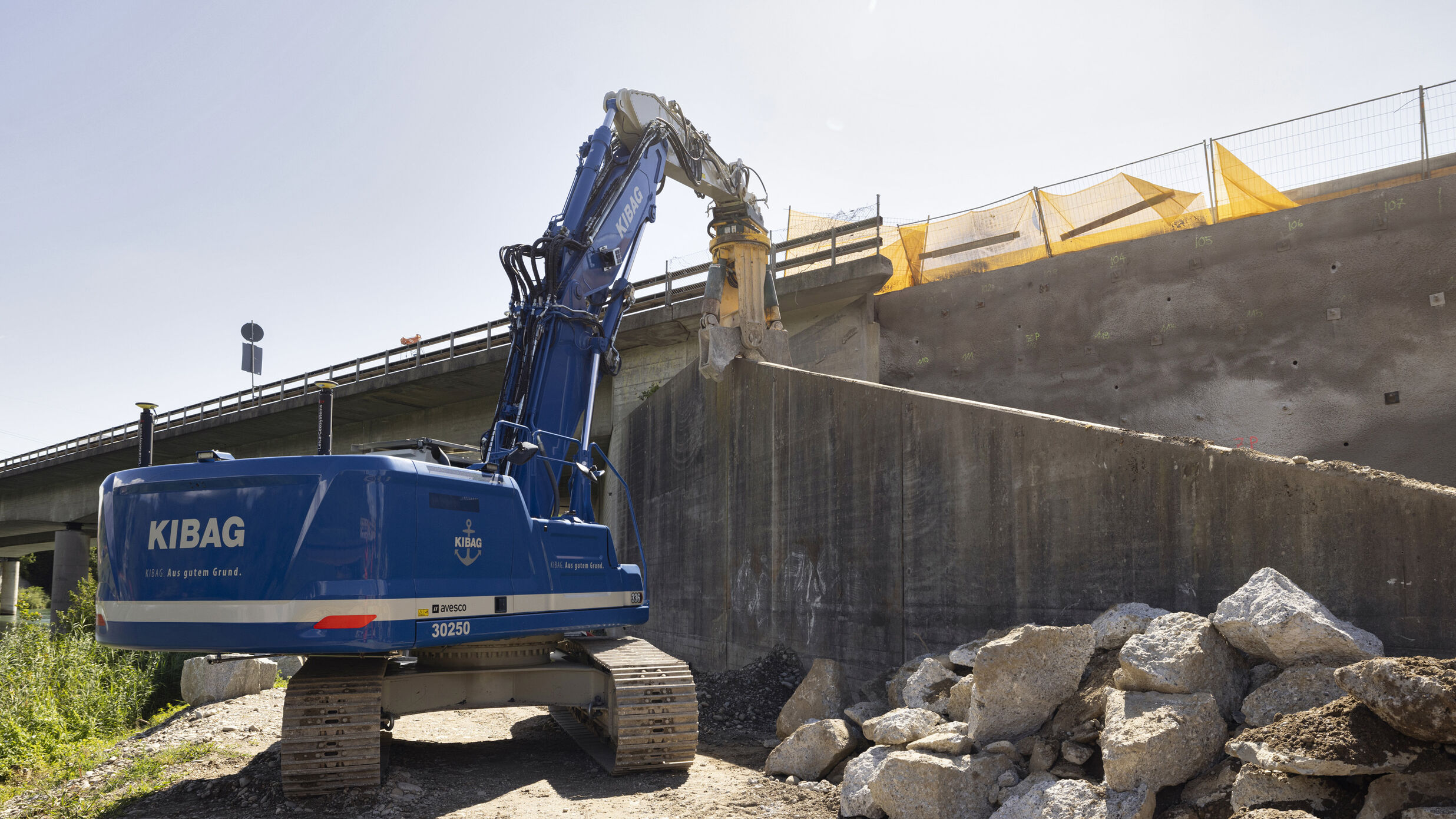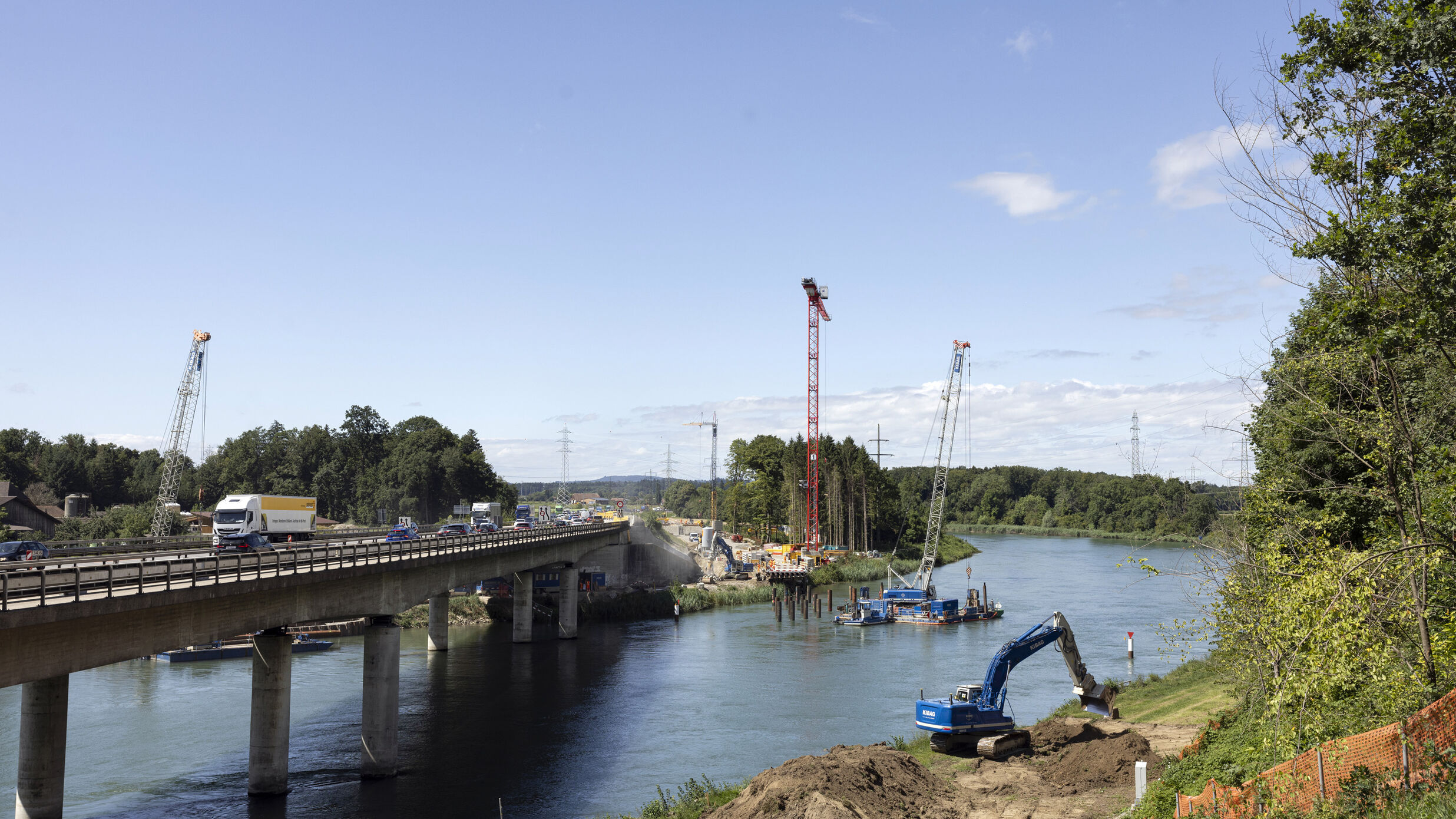 Ein weiteres, nicht alltägliches Projekt ist die neue Aarebrücke, die neben der bestehenden Brücke errichtet werden wird. Damit der Verkehr später über die neue Brücke rollen kann, müssen Tausende Kubikmeter Material abgetragen und abtransportiert werden. In diesem Bereich wird das neue Trassee bis zu zwölf Meter in den bestehenden Hang gebaut. Dieser wird nun mit einem modernen 3D-Bagger der KIBAG abgetragen. Ein eindrücklicher Arbeitsplatz – hoch über Aare und Autobahn –, wo der neue Unterhaltsweg entsteht.