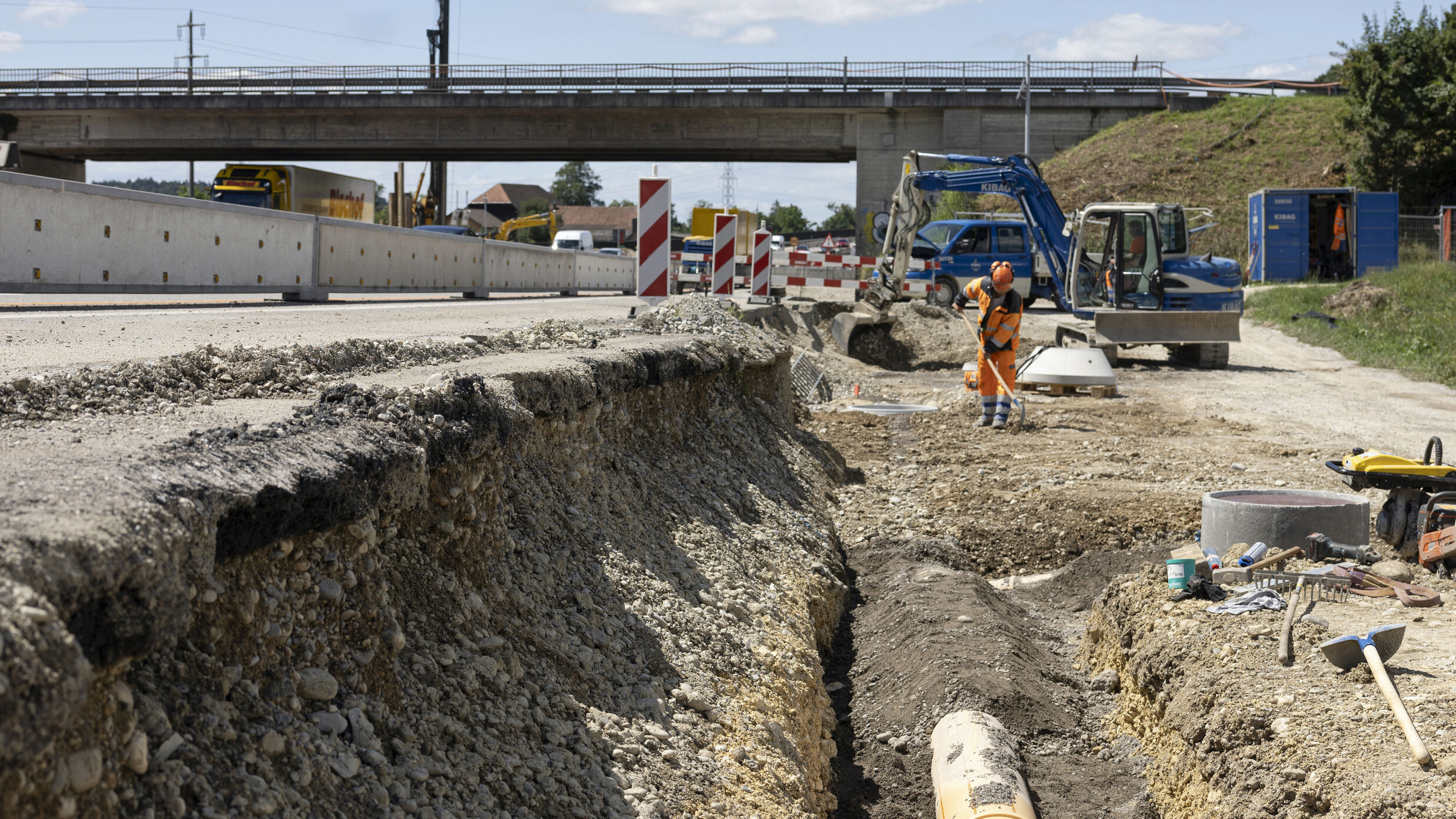 Auf den einzelnen Abschnitten laufen parallel diverse Arbeiten. Es werden zahlreiche Entwässerungsleitungen, Schüttungen, Betonarbeiten, grosse Erdbewegungen und viele weitere Arbeiten ausgeführt. Insgesamt sind über hundert Personen vor Ort, verteilt auf etwa fünf Kilometer und diverse Teilprojekte. Zahlreiche Arbeiten drehen sich um die zwei neuen SABA-Anlagen, die Strassenabwasser-Behandlungsanlage. Gemäss den neuen Gewässerschutzvorschriften des Bundes dürfen Strassenabwässer stark befahrener Strassen nicht mehr unbehandelt abgeleitet werden. Die SABAs filtern das Strassenabwasser, bevor es in ein Gewässer oder in den Boden gelangt. Damit erfüllen sie eine wichtige Funktion für die Umwelt. Die neuen, sogenannten Centub-Rohre, die das Strassenabwasser ableiten, sind im Zuge des Autobahnausbaus selbstverständlich grösser dimensioniert – sie haben einen Durchmesser von bis zu 1200 Millimetern. Auch verschiedene weitere Werkleitungen – unter anderem die neuen Rohranlagen für die Betriebs- und Sicherheitsausrüstung (BSA) – kommen neu in den Boden. Beim Schachen in Deitingen entsteht das neue Pumpwerk für die SABA. Derzeit befindet sich dort eine Tiefbaugrube direkt neben der Autobahn.