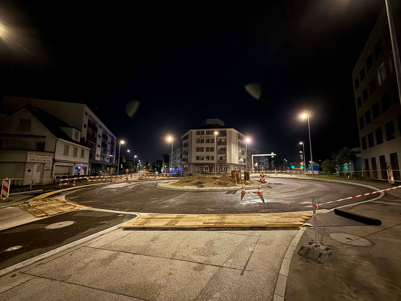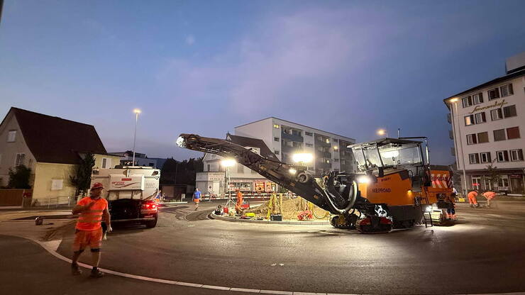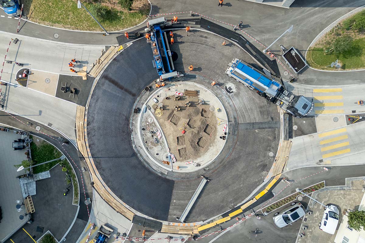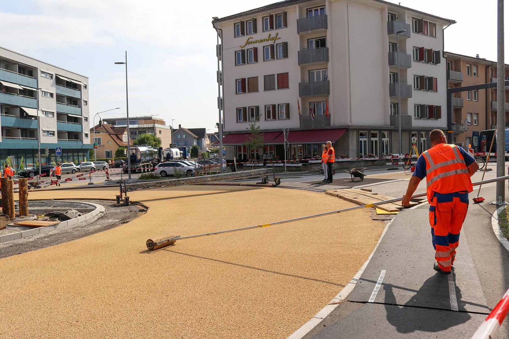 Damit alles exakt passte, kam modernste 3D-Technik zum Einsatz. Die Fräsen arbeiteten millimetergenau, Schichtdicken wurden digital gesteuert und laufend überprüft durch die Infra der KIBAG. Von jedem Lkw wurde eine Probe genommen, die im Labor geprüft wurde, um Zusammensetzung und Bitumenqualität sicherzustellen. «Die Garantiefrist beläuft sich für die fertiggestellte Strasse auf fünf Jahre – bei täglich 20 000 Fahrzeugen darf nichts schiefgehen, sonst wird es teuer.» Während des Einbaus wird direkt hinter der Bohle vom Fertiger der Splitt eingestreut und mit einer kleinen Rolle von Hand angewalzt, damit es einen Verbund vom Splitt zum Gussasphalt gibt. Nicht nur die Optik überzeugt: Der weisse Splitt reduziert die Hitzeentwicklung im Sommer und verbessert die Sichtbarkeit. Statt einer dunklen, Wärme abstrahlenden Fläche entstand ein heller, freundlicher Kreisel.