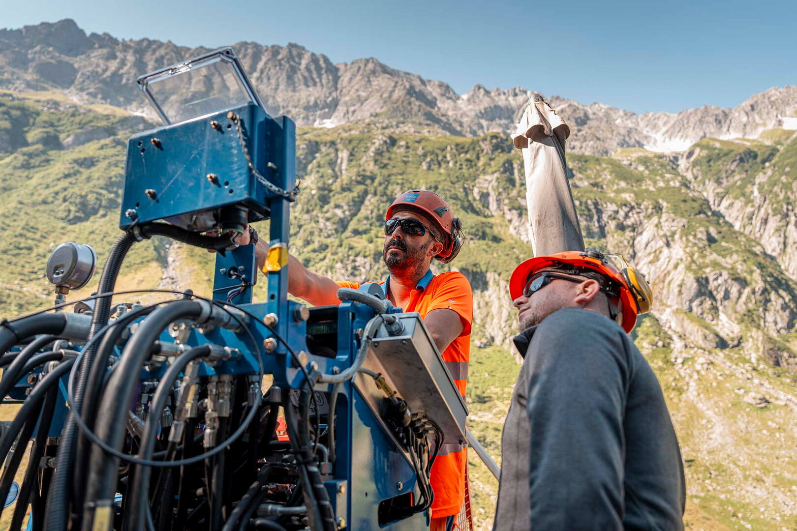 Zum Einsatz kamen unterschiedliche Bohrgeräte: eine Versadrill mit Hydraulikeinheit für die Kernbohrungen mit 96 mm Durchmesser sowie ein 5,5 Tonnen schweres, zerlegbares Leichtbohrgerät, das für den Helitransport ausgelegt und bei den vertikalen Bohrungen im Lockergestein verwendet wurde. Über 150 Helikopterflüge waren für das gesamte Projekt notwendig, darunter auch drei Einsätze mit einem Schwerlasthubschrauber für den Transport der Maschinen.