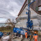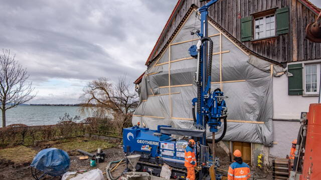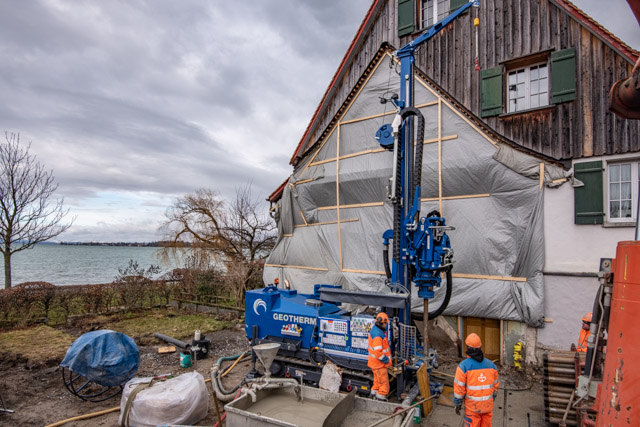 Die kompakte Bauweise kam dem GEOTHERM-Team bei ihrem Einsatz in Ermatingen zugute. Die Baustelle lag zwischen zwei Häusern und grenzte fast direkt an den Bodensee. Dort, an der Seeuferstrasse, sollte für den Neuanbau sowie für das bestehende Gebäude eine Erdwärmesondenbohrung à 250 Meter Tiefe im Ton-Spülbohrverfahren abgeteuft werden.