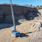 In der Kiesgrube ragt eine 30 Meter hohe Kieswand empor. Dort bearbeitet unser legendärer 63-Tonnen-Bagger «T-Rex» mit seinem 37 Meter langen Arm und einem Druck von 35 Bar den dicht gelagerten Kies. Da sich das Kieswerk im Grundwasserbereich befindet, kann das Material mit sauberem Grundwasser von den Wänden gelöst werden. Abhängig von den Bestellungen und dem Bedarf kommt er mehrmals pro Woche zum Einsatz. Je nachdem wie die Wand abhängt, können sich 5000 bis 7000 Tonnen auf einmal von der Wand lösen.