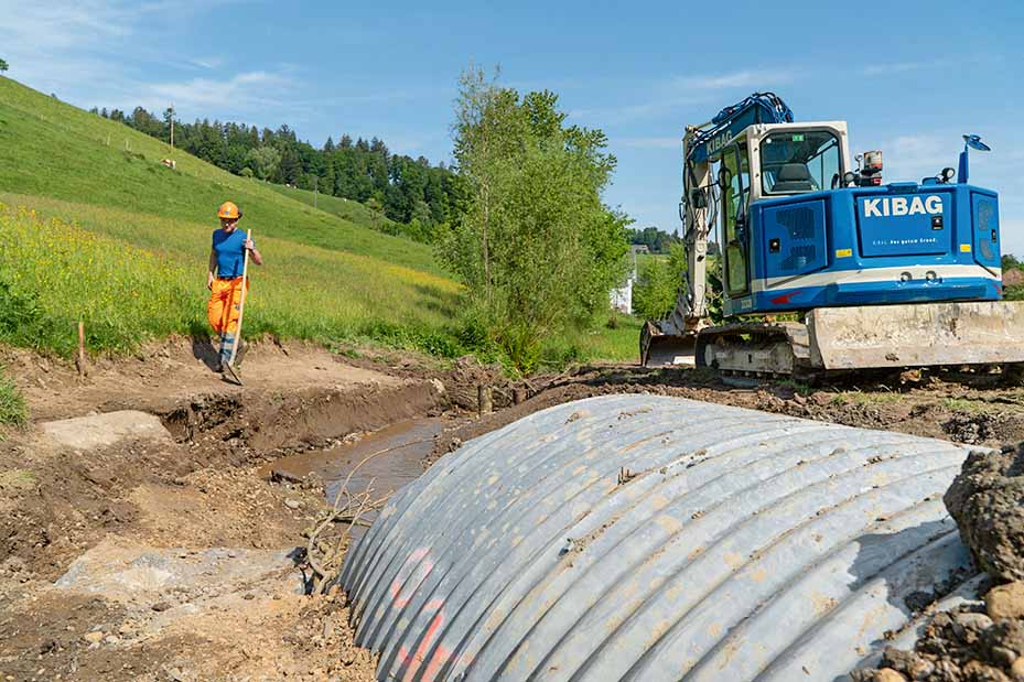 Das letzte grosse Hochwasser von 2017 verursachte starke Schäden an den Uferböschungen des Rohrbachgrabenbachs. Die grössten Schäden wurden behoben. Es war jedoch unverkennbar, dass am und um das Gewässer konkretere Massnahmen nötig waren. Der Hochwasserschutz sollte nachhaltig verbessert und der Bach ökologisch revitalisiert werden. Bauführer Matthias Lustenberger ist mit einem Team der KIBAG Huttwil mit dem Bau von neuen, grösseren Bachdurchlässen bei den Strassenquerungen sowie der Revitalisierung des Bachlaufs betraut.