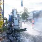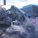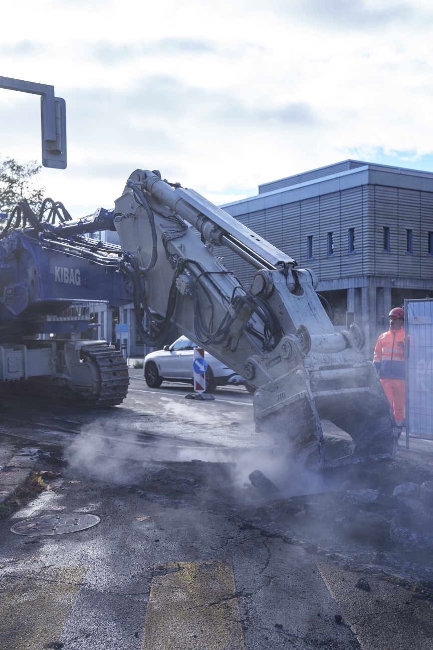 Bis zu 21'000 Fahrzeuge passieren täglich die vielbefahrene Kreuzung der Buchser- und Suhrerstrasse mitten in Aarau. Am 11. und 13. November waren unsere Mitarbeiter der KIBAG Oftringen vor Ort, um in zwei Etappen 120 Meter der alten Gleisanlage der ehemaligen Wynental-Suhrentalbahn (WSB) rückzubauen. Den eigentlichen Schienenabbruch besorgte ab 10 Uhr unser Grossbagger Hitachi 690, genannt «Terminator». Danach wurden die Schienenstücke und der Betonabbruch entfernt, am Mittag die Planie und der provisorische Belag eingebaut, und bereits um 16 Uhr wurde die Kreuzung wieder für den Verkehr freigegeben.