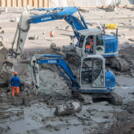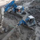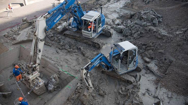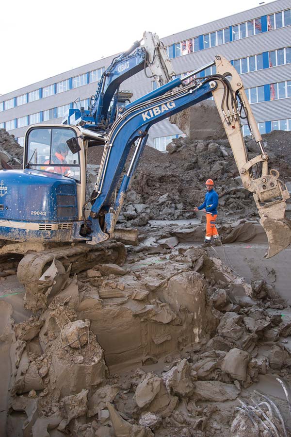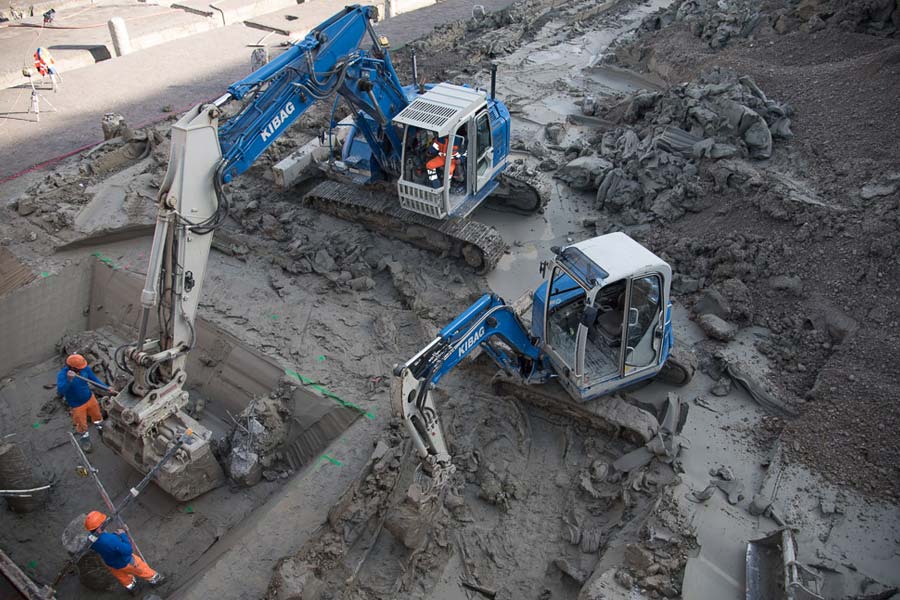 Von Ende August bis Dezember waren wir mit dem Aushub von 40'000 Kubikmetern Lehm beschäftigt. Bei trockenem Wetter war das problemlos, doch sobald es nass wurde, verwandelte sich der Lehm in eine glitschige Masse. Zeitgleich zum Lehmaushub erstellten wir die Sauberkeitsschicht mit Magerbeton auf einer Fläche von 10'000 Quadratmetern.