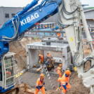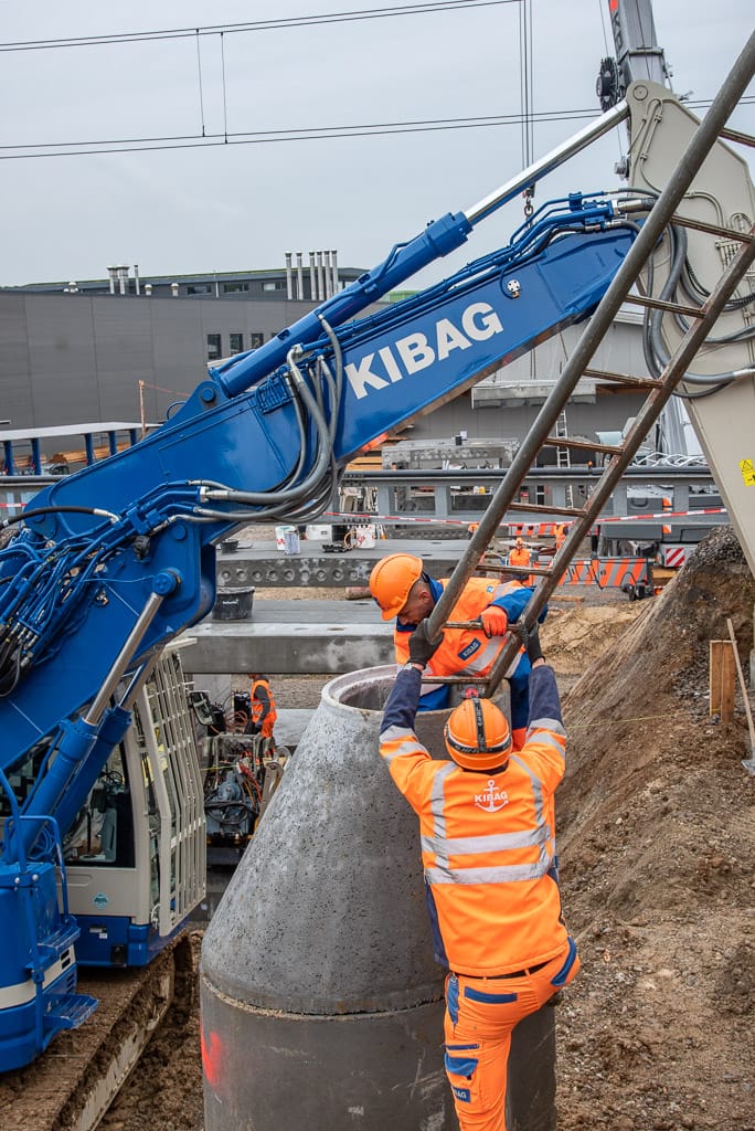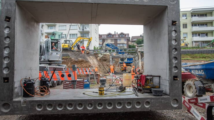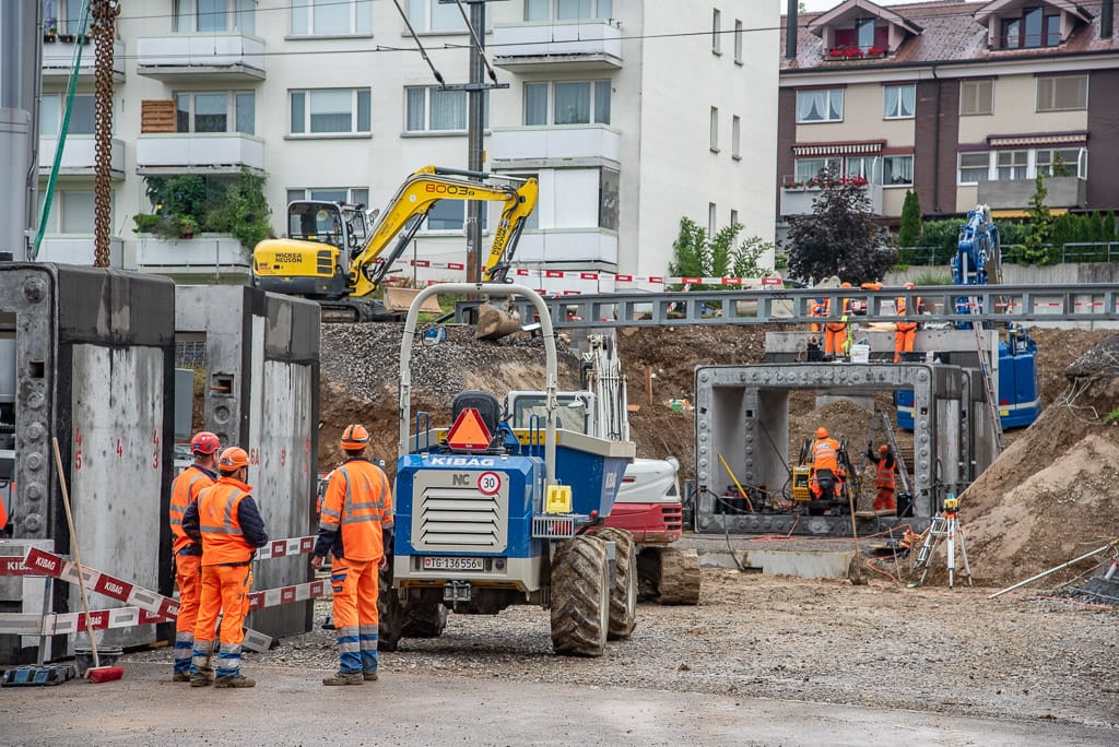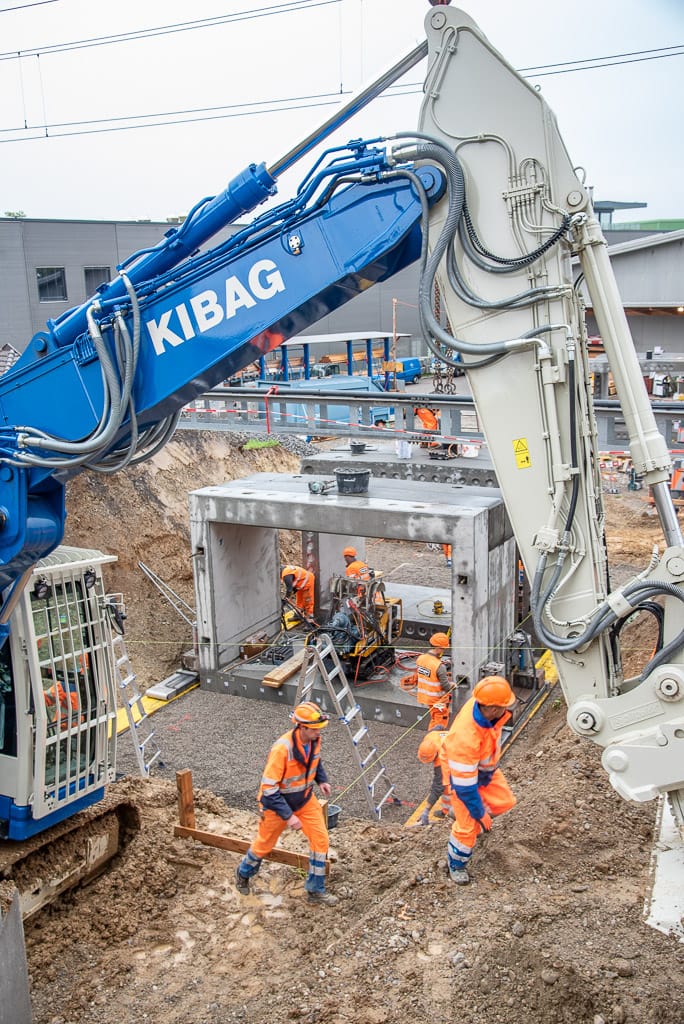 Am ersten Septemberwochenende haben Mitarbeitende der KIBAG St. Gallen und KIBAG Thurgau im Quartier Bildfeld Bronschhofen TG eine vier Meter breite Personenunterführung eingebaut. In der Mitte der Bildfeldstrasse im Industriegebiet waren in den Wochen vor dem Einbau bereits viele vorbereitende Aushubarbeiten ausgeführt worden. Auch die Kanalisation für einen Teil des Quartiers wurde verlegt bzw. erneuert.