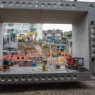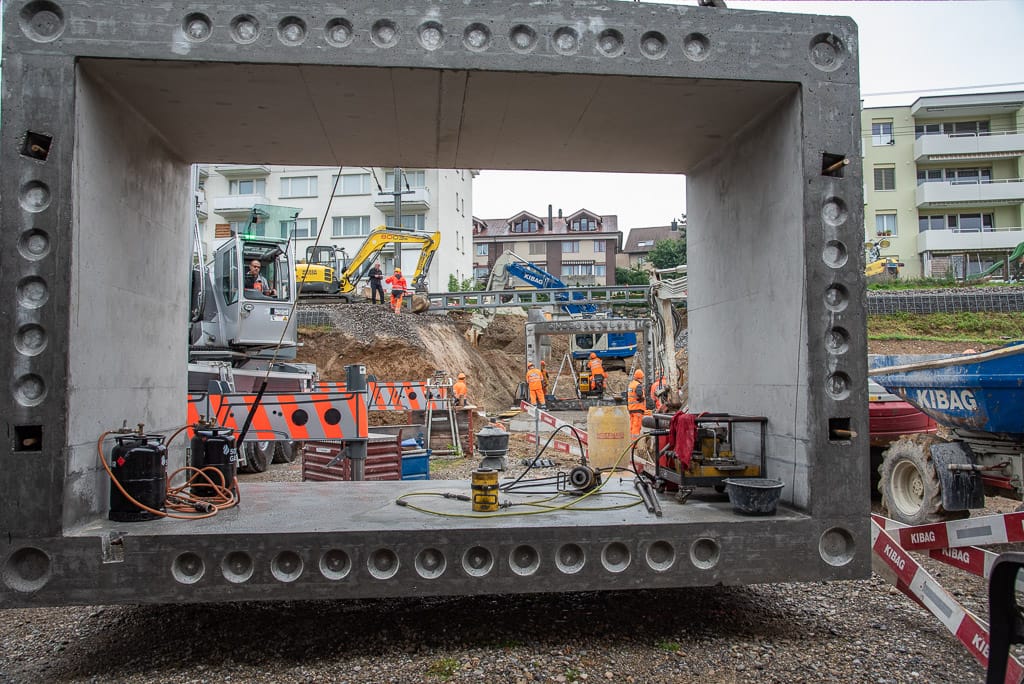 Die fünf Normelemente für die Unterführung, je 25 Tonnen schwer, trugen ebenfalls zur kurzen Bauzeit bei. Alles lief perfekt ab. Ein Element nach dem anderen wurde in der planierten Baugrube auf eine Art Stahlschiene gehievt. Sie liessen sich so wie von Geisterhand verschieben und wie Legosteine zusammenfügen.