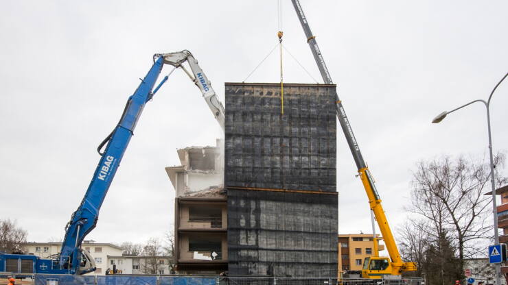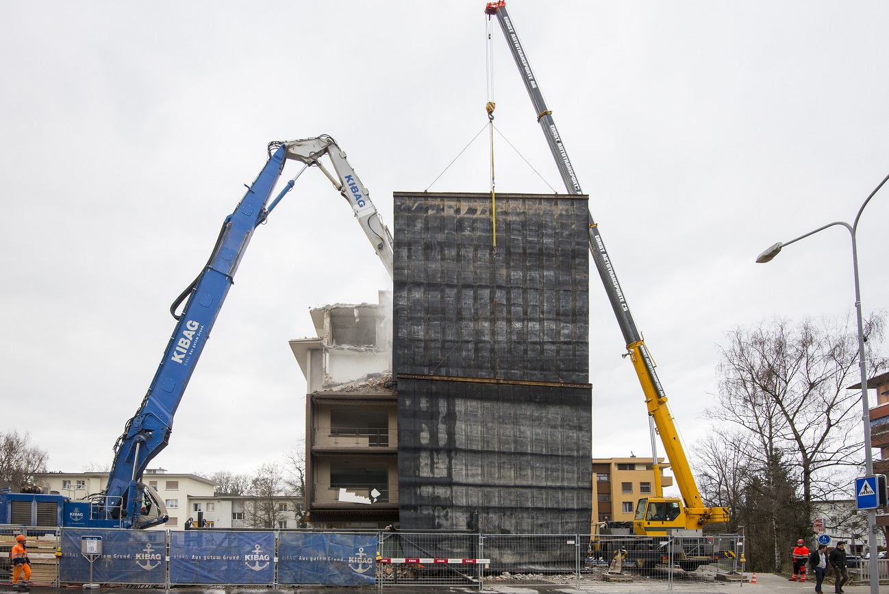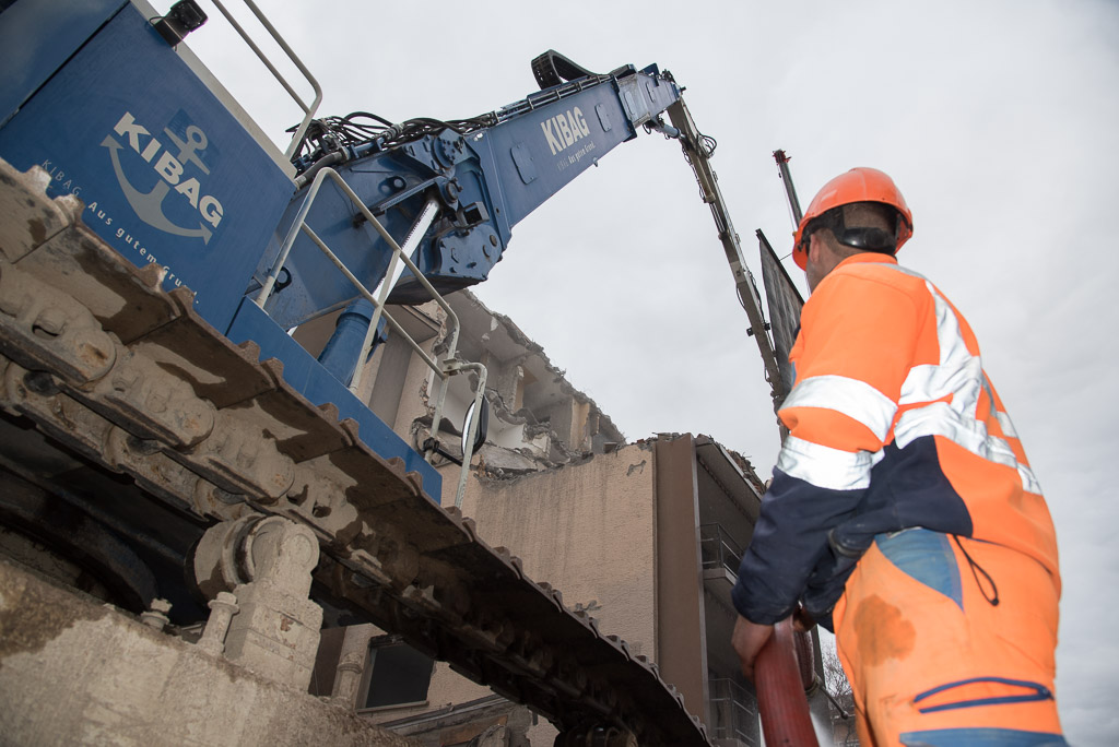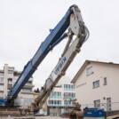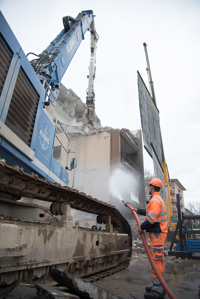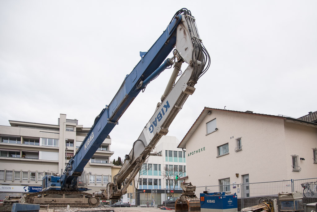 Die KIBAG Winterthur baut derzeit an der Schaffhauserstrasse in Kloten 14`500 Kubikmeter umbauten Raum zurück. Eine grosse Herausforderung sind die engen Platzverhältnisse, da sich die Baustelle mitten im Stadtzentrum von Kloten befindet und stark fussgängerfrequentiert ist.