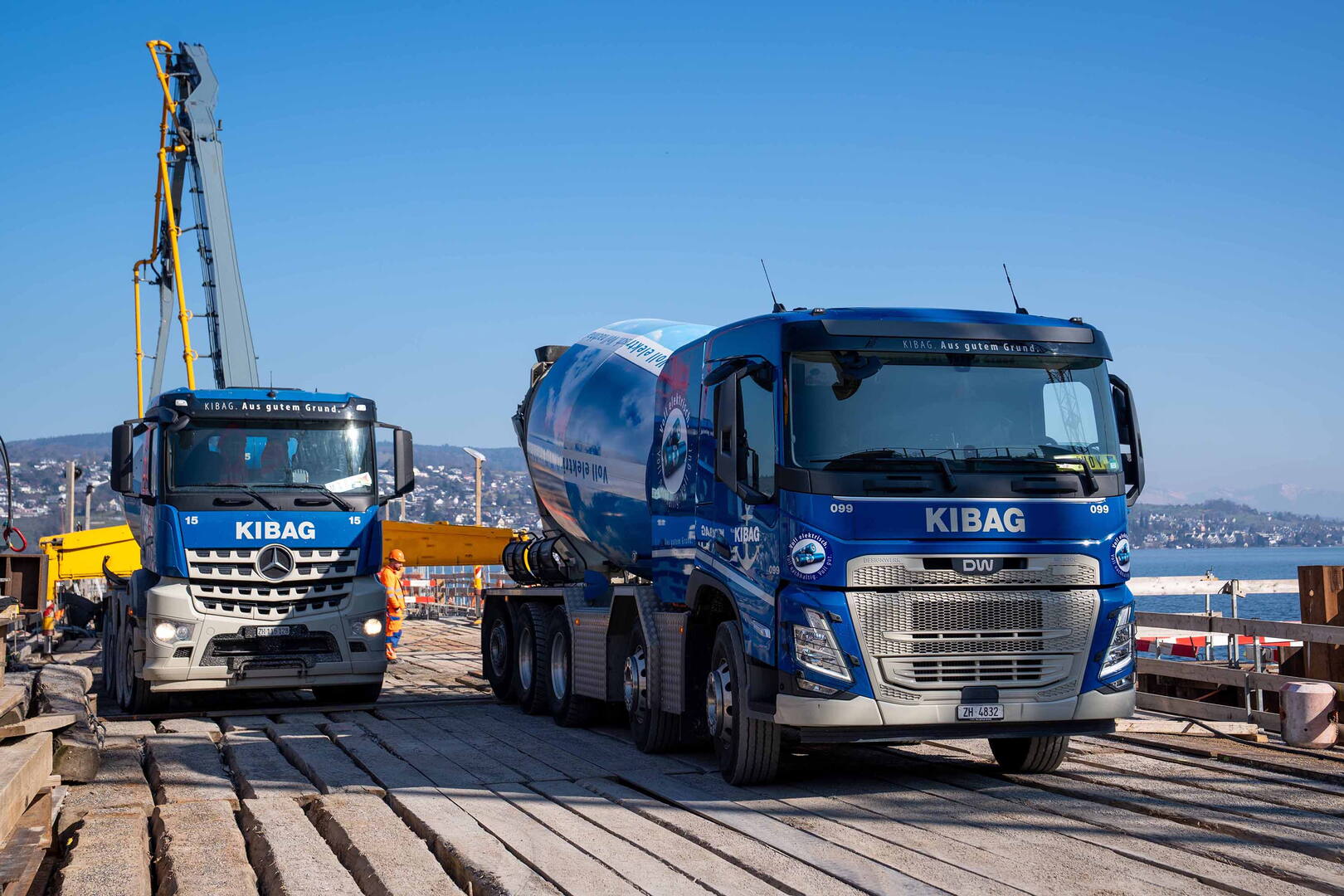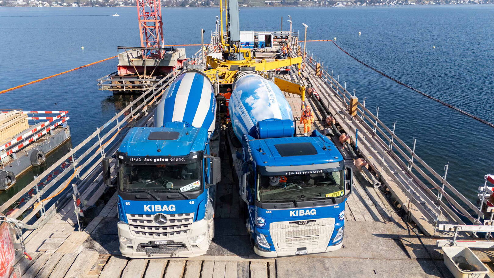 sei sehr zufrieden. Nebst der Betonlieferung verantwortete die KIBAG auch die Abfuhr eines Teils des Aushubmaterials des Einlauf- und des Auslaufbauwerks: Insgesamt werden rund 160 000 Tonnen an sauberem Aushubmaterial, belastetem Material und Seegrubenaushub abgeführt. Ausserdem liefert die KIBAG ca. 30 000 Kubikmeter Kies.