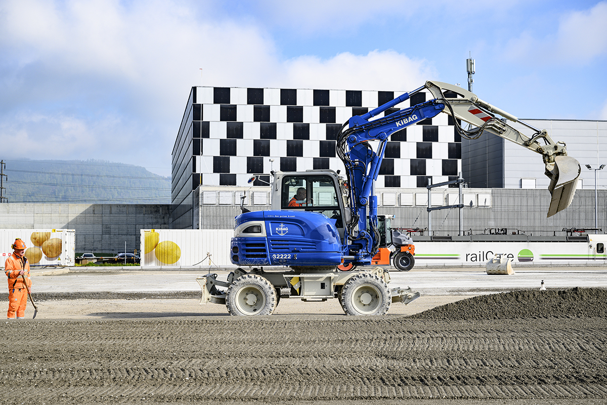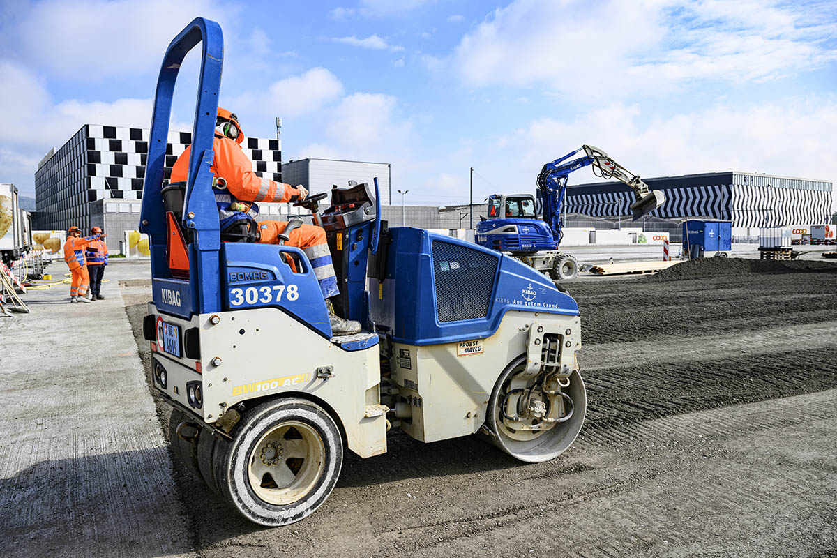 KIBAG Bauführer Manuel Kiener klärt uns auf: Walzbeton besteht aus recyceltem, erdfeuchtem Beton. Er enthält weniger Zement als konventioneller Beton. Wegen seiner Tragfähigkeit und Verformungsstabilität sowie auch seiner Verschleissfestigkeit wird er vor allem auf Verkehrsflächen mit sehr hoher Beanspruchung eingesetzt. Für das schweizweit grösste Logistikzentrum von Coop wurde in den letzten Wochen eine Fläche von 11'000 Quadratmetern betoniert. Sie soll maximal strapazierfähig sein, da hier praktisch rund um die Uhr Coop-Container vom nahegelegenen Bahngleis zwischengelagert und mit Lastwagen weitertransportiert werden. Walzbeton gilt als besonders strapazierfähig und formstabil. Durch die hohe Druckfestigkeit hält er bis zu 40 Jahre.